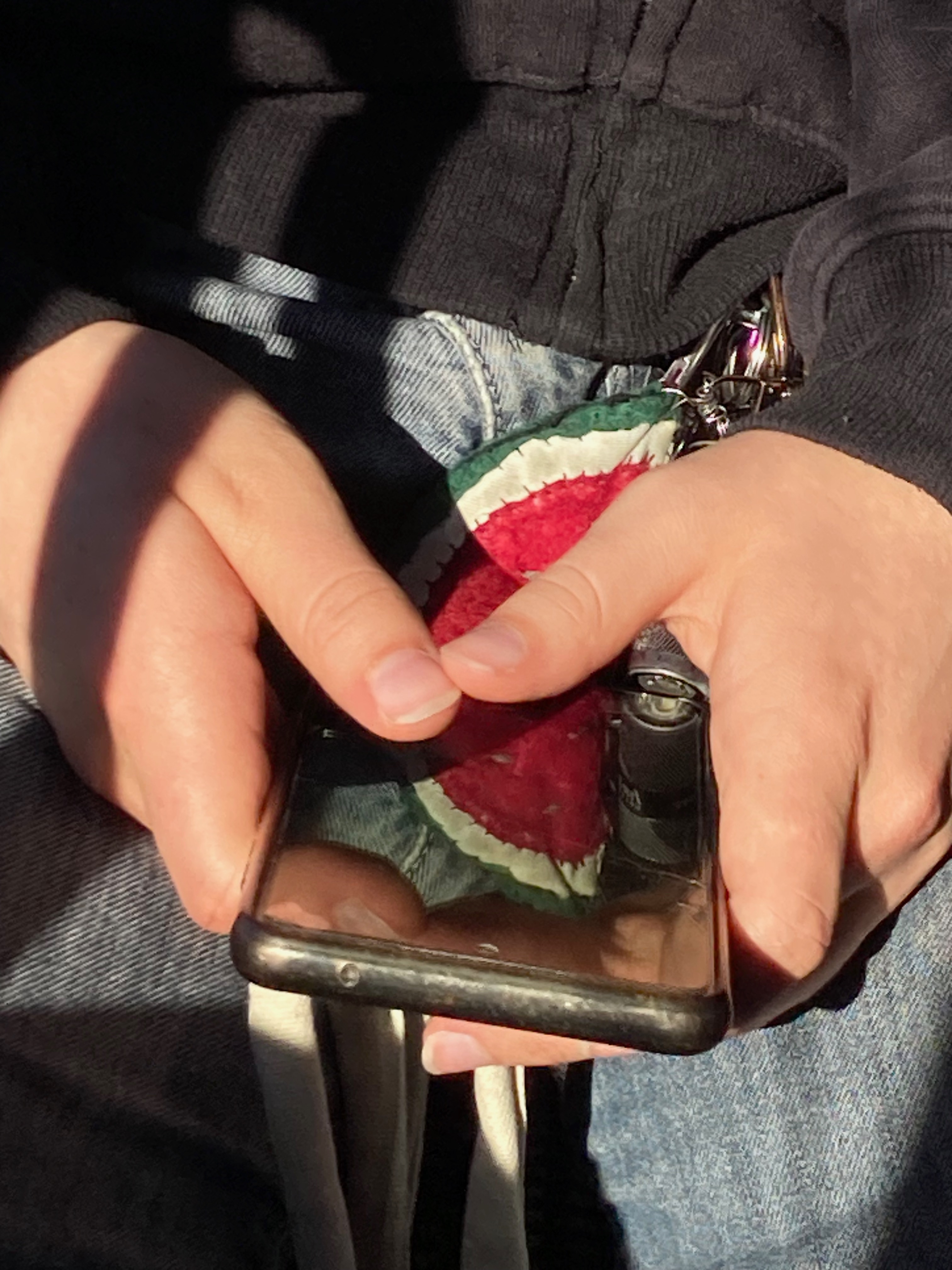 An iPhone photo of my hand against the Lisbon sky on September 25, 2022. Laura is driving her Mercedes to Cova de Vapor, a beach near Trafaria, where it will be sunny (and windy!). This was a good day: I took a plane from Madrid at 6:30, arrived at Lisbon at 6:50, where Laura picked me up, went straight to bed to rest, woke up and went to the beach.